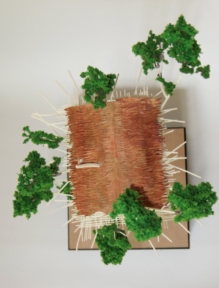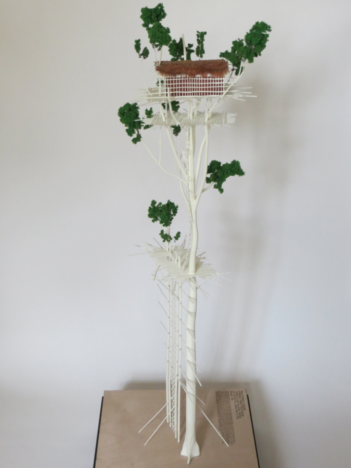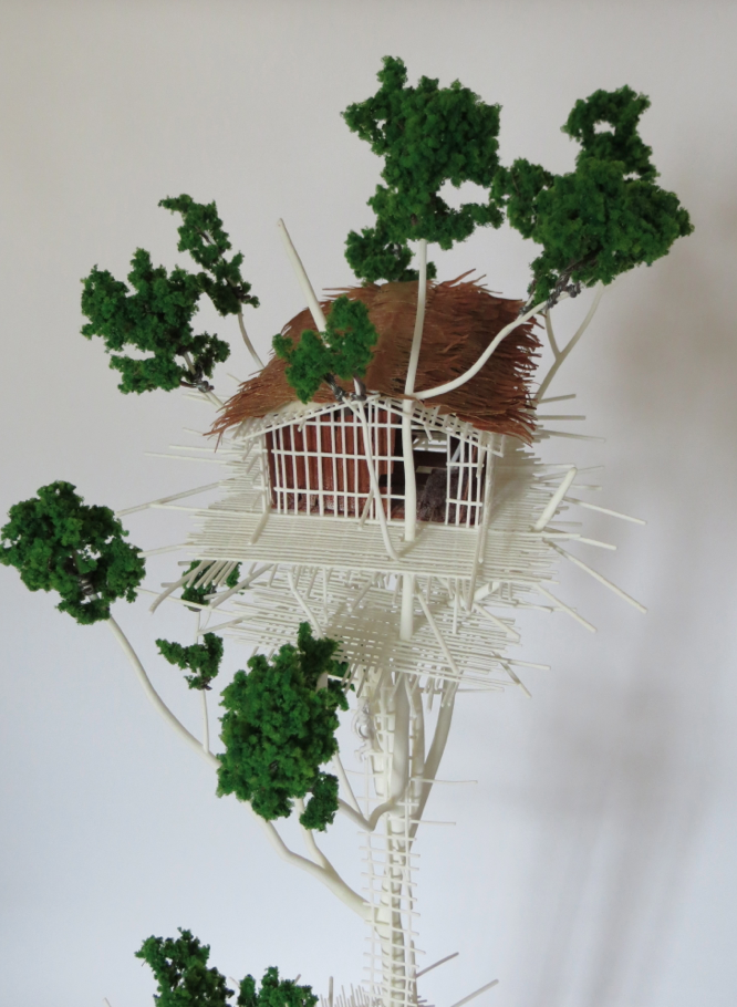 Printed by selective laser sintering this 1:50 scale model constructed by WSDResearch forms part of a project examining the tree house structures of the Korowai people living in the Jungles of the South Eastern Papua. To escape threats including flooding, insects and rival clans the Korowai people construct tree houses in trees that can grow to 50-60 meters tall. Also aiming to gain respect from other clans the taller they build the houses the more respect they gain. Once a suitable tree has been chosen construction begins. Using many felled trees cut with stone age tools, around 5000m of rattan twine, 30 bundles of sago palm leaves for the roof and 20 rolls of tree bark for the floor and walls. Around forty clan members build these amazing constructions in about two weeks. With knowledge combined with skill and ingenuity the Korowai people have mastered their environment showing it a respect that is being lost elsewhere. Living a remarkable life in harmony with nature.