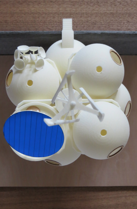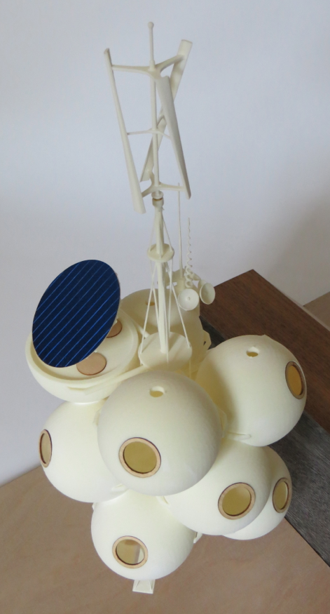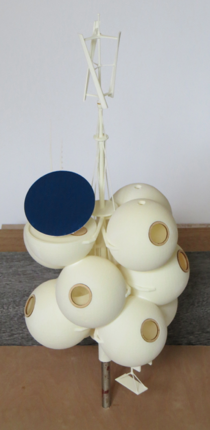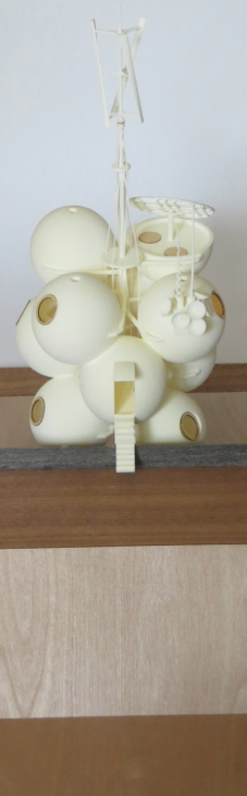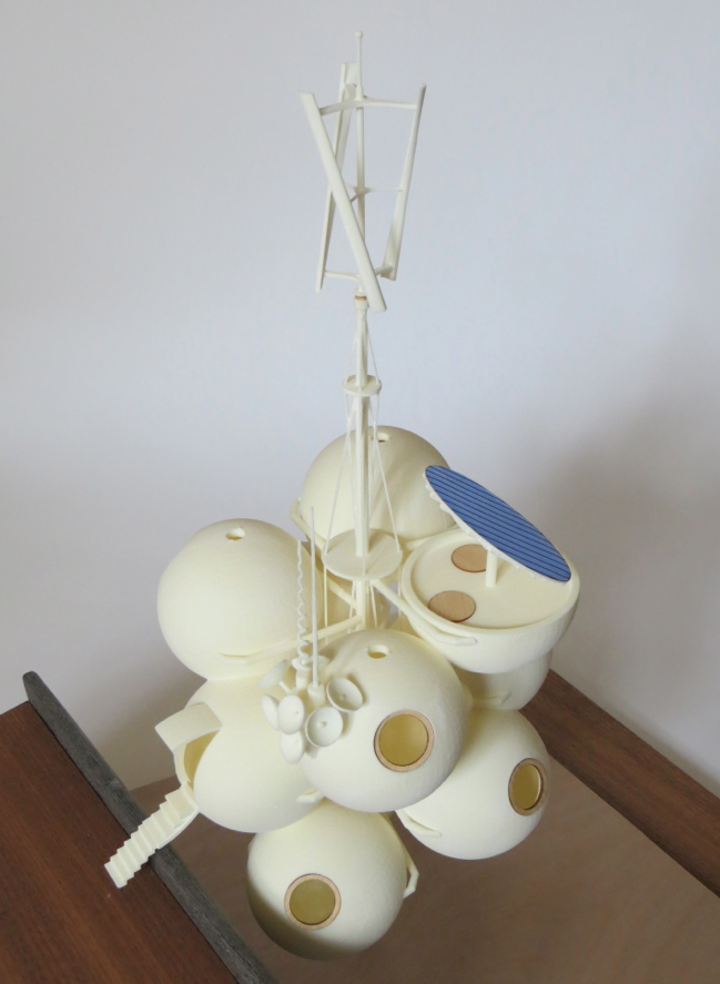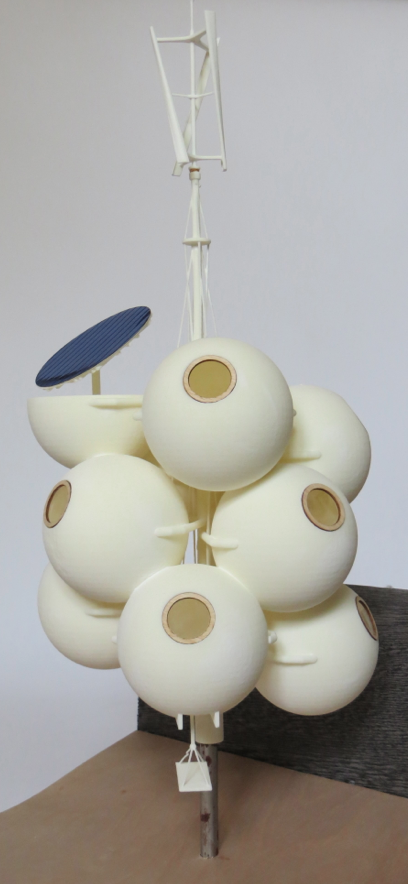 The prototype explores the possibility of a fully self sufficient pod dwelling. Taking inspiration from anatomical circulation and yacht mast technology, the pods (organs) are supported by and circulate around a central mast (spine). The mast supports 10 complete pods and a solar capture pod with the top of the mast housing a wind turbine.
