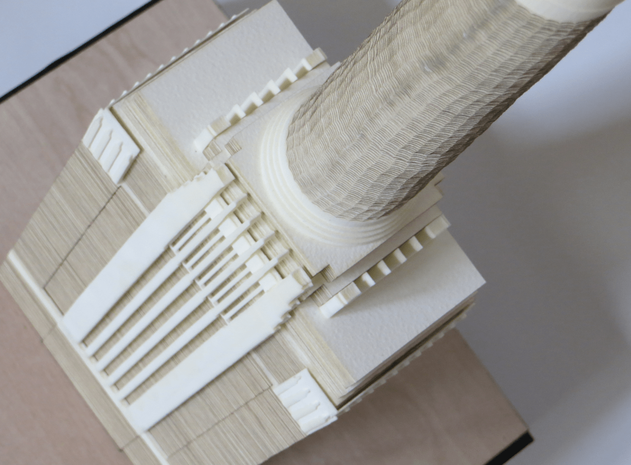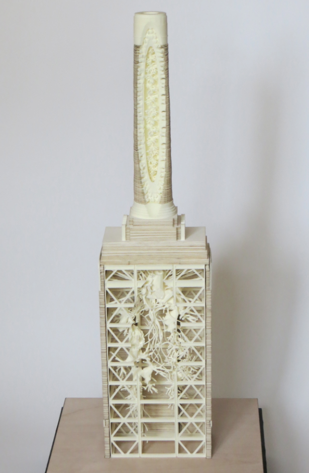 Digitally dissecting one of the chimneys of Gilbert Scotts Battersea Power Station to reveal a convergence of lung anatomy and internal steel structure, constructed of laser cut planar slices of hand made watercolour paper for the chimney and SLS 3d printed nylon polymer for the anatomy, the model articulates a language between digital manufacturing fabrication processes and the individual elements of a hand crafted technique.